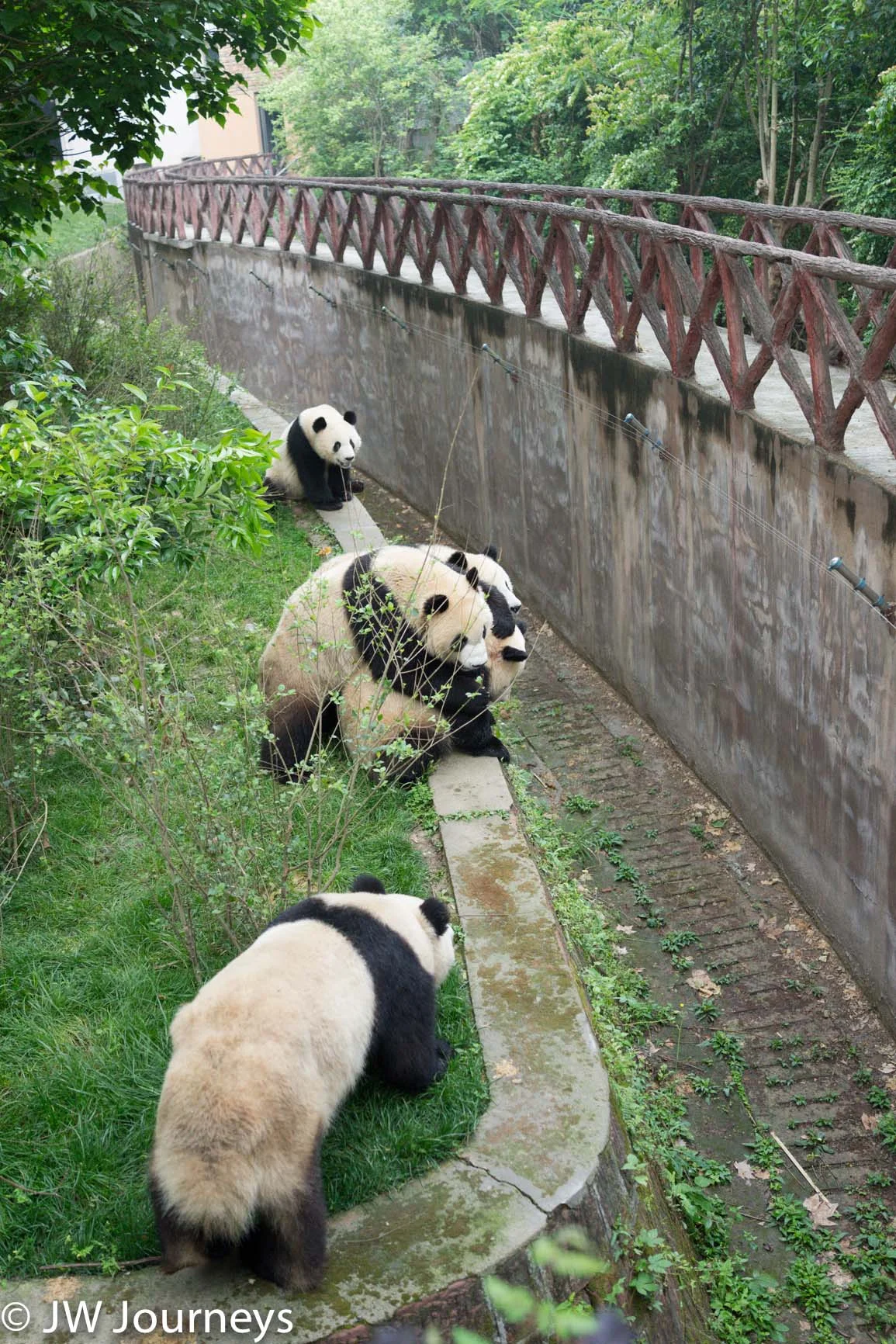 The cubs all live together until 2.5 years old as they will start getting territorial. Everyday, Pandas are given a five grain pastry and an apple as supplement.